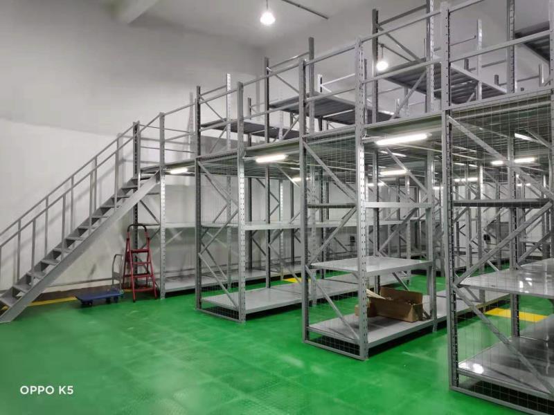 閣樓貨架系統(tǒng),通常利用中型擱板式貨架或重型擱板式貨架作為主體支撐加上樓面板(根據(jù)貨架單元的總負載重量來決定選用何種貨架),樓面板通常選用冷軋型鋼樓板、花紋鋼樓板或鋼格柵樓板。近幾年多使用冷軋型鋼樓板,它具有承載能力強、整體性好、承載均勻性好、精度高、表面平整、易鎖定等優(yōu)勢.有多種類型可選,并且易匹配照明系統(tǒng),存取、管理均較為方便。單元貨架每層載重量通常在500kg以內(nèi),樓層間距通常為2.2m~2.7m,頂層貨架高度一般為2m左右,充分考慮工作人員操作的便利性。